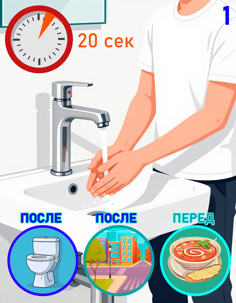 1. Мытье рук. Самый эффективный способ профилактики. Делайте это после улицы, перед едой и после контакта с поверхностями в транспорте.